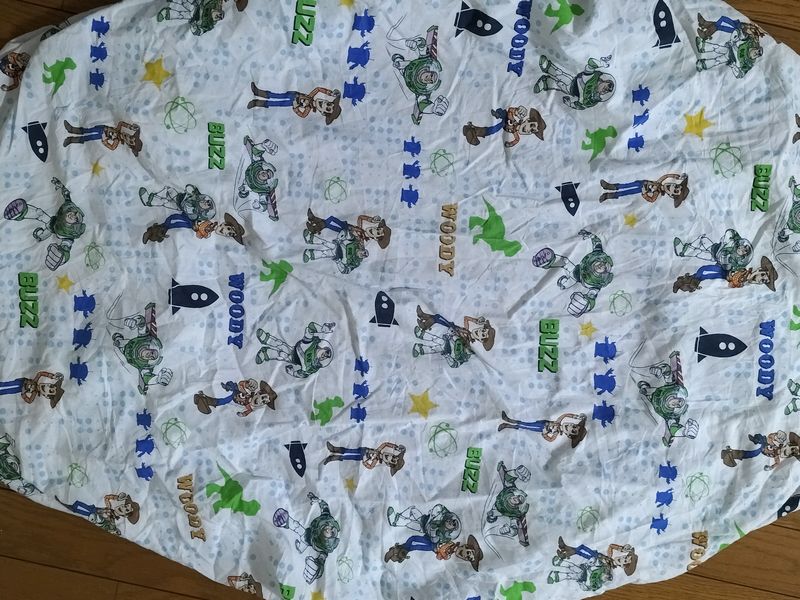 トイストーリー、ベビー用フィットシーツ トイストーリー、ベビー用フィットシーツ (fb0144) ベビー用マットレスにかぶせるタイプで最大幅は縦146cm横100cm。 55%コットン45%ポリエステル、CHINA製。 生地の端、折り返し部に小傷あります。 すべての辺にゴムが入っています。 1枚め画像右のウッディが縦9.5cm。 シワ、ごくこまかな汚れはあります。 目立つ傷や汚れ毛玉はありません。 プリント発色よくきれいです。 生地もしっかりです。 中央と端の色の差もみられません。 補償なし300円。 在庫状態 : 在庫有り ¥1,900(税込) 数量